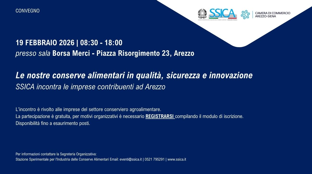 La Stazione Sperimentale per l’Industria delle Conserve Alimentari (SSICA) – Fondazione di Ricerca, organizza il convegno dal titolo “Le nostre conserve alimentari in qualità, sicurezza e innovazione”, che si terrà il 19 Febbraio 2026, dalle ore 8.30 alle 18.00 presso la sala convegni Borsa Merci di Arezzo (Piazza Risorgimento 23, Arezzo), con il patrocinio della Camera di Commercio Industria Artigianato e Agricoltura di Arezzo-Siena.